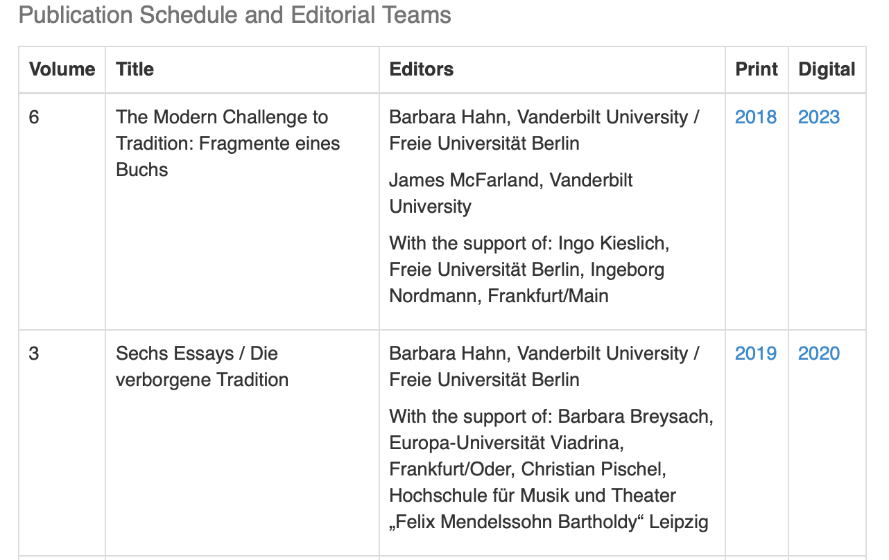 The “Text” section currently lists 17 edited volumes, but only three are available up to now (see Fig. 8). Titles and sections related to volumes not yet accessible are displayed in gray, aligning with the planned future “Publication Schedule”. However, it might be more effective to make only the completed documents visible, temporarily removing the grayed-out display for incomplete ones. This could enhance the user experience by avoiding a sense of incompleteness and potential disorientation.