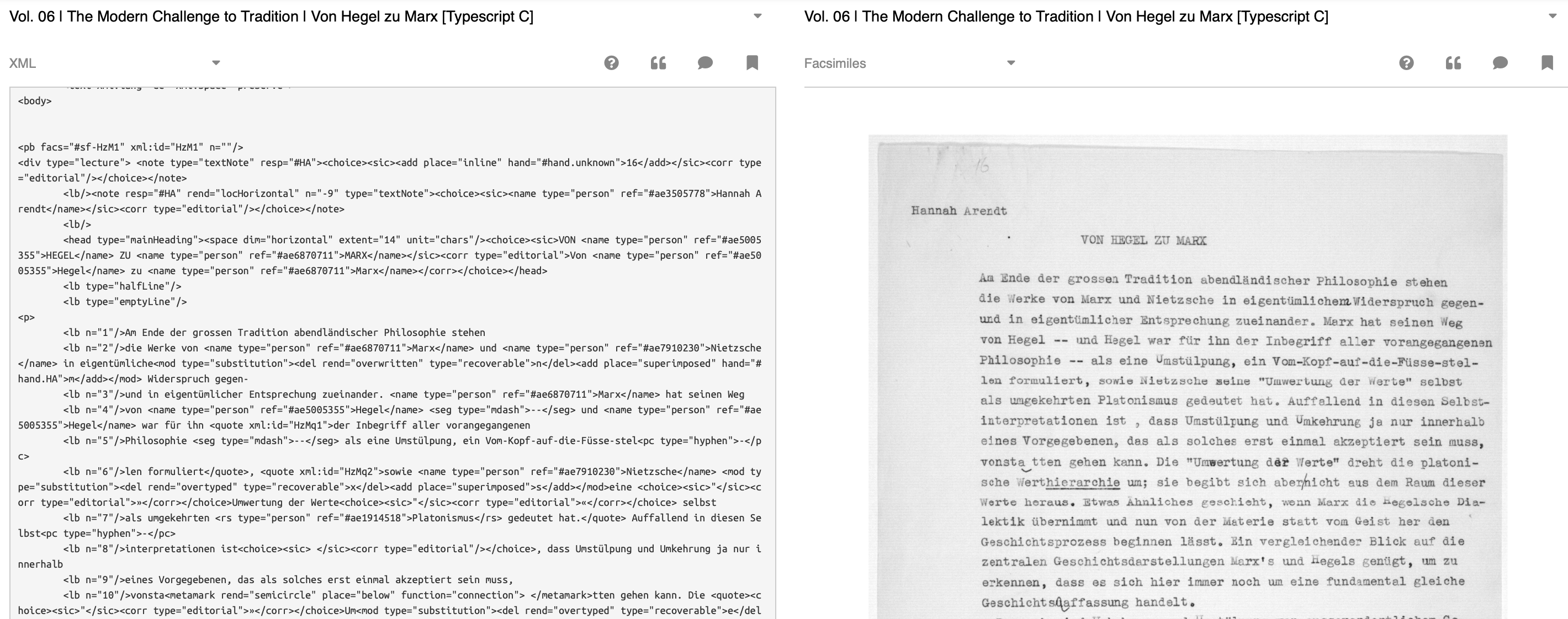 10The HA.CW.CE employs a hybrid approach3 that integrates both printed and digital formats, leveraging the strengths of each. The print edition offers a carefully edited, annotated version of Arendt’s works with critical commentary, providing a stable and permanent scholarly resource. In contrast, the digital edition enriches this by offering interactive features, such as diplomatic transcriptions, facsimiles, and XML-TEI documents, with all textual variants and editorial markup visible for direct analysis. This methodology creates a comprehensive environment for studying Arendt’s works, allowing users to explore and analyze texts in multiple formats. The printed edition maintains the tangible dimension of a text, while the digital version offers dynamic features such as advanced search tools, interactive collation, and global access.
