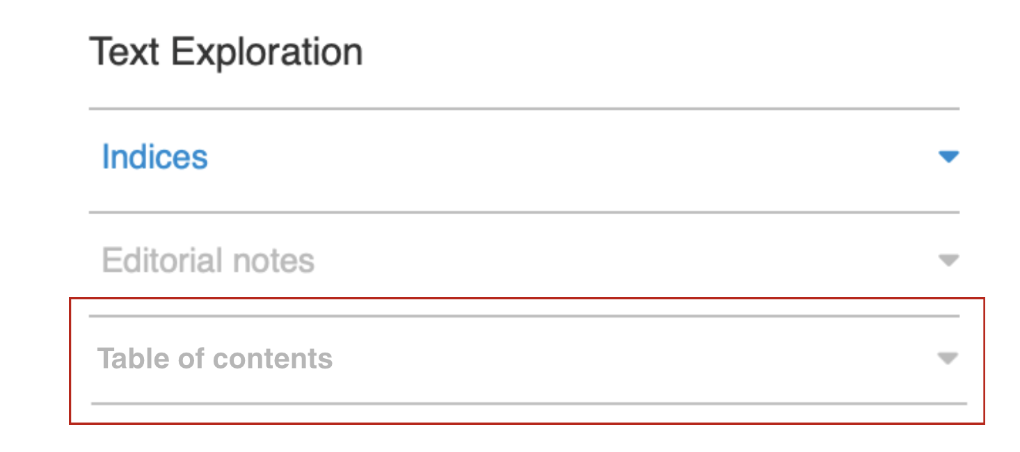 - Text Exploration, with “Indices” and “Editorial notes” (the latter are not available).