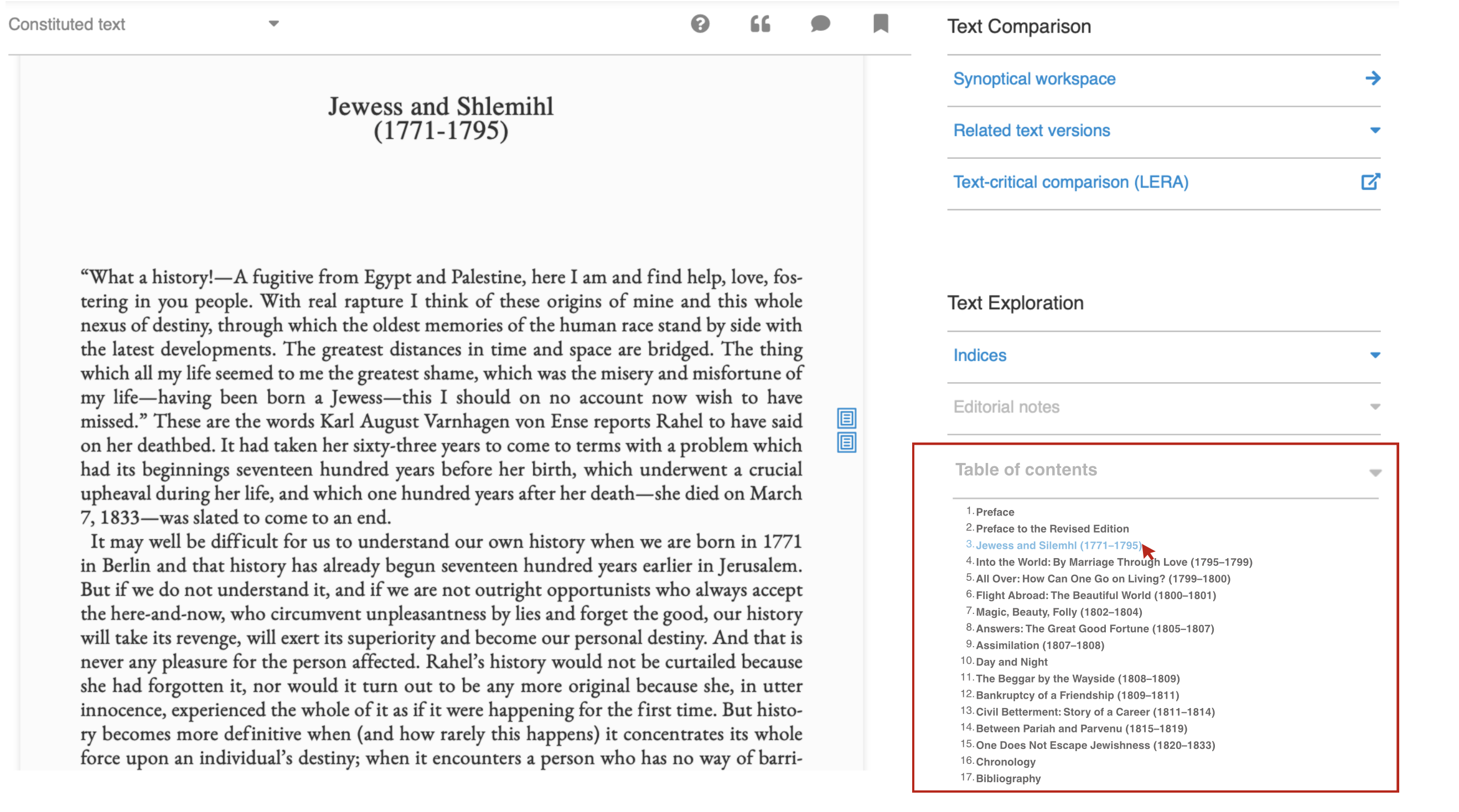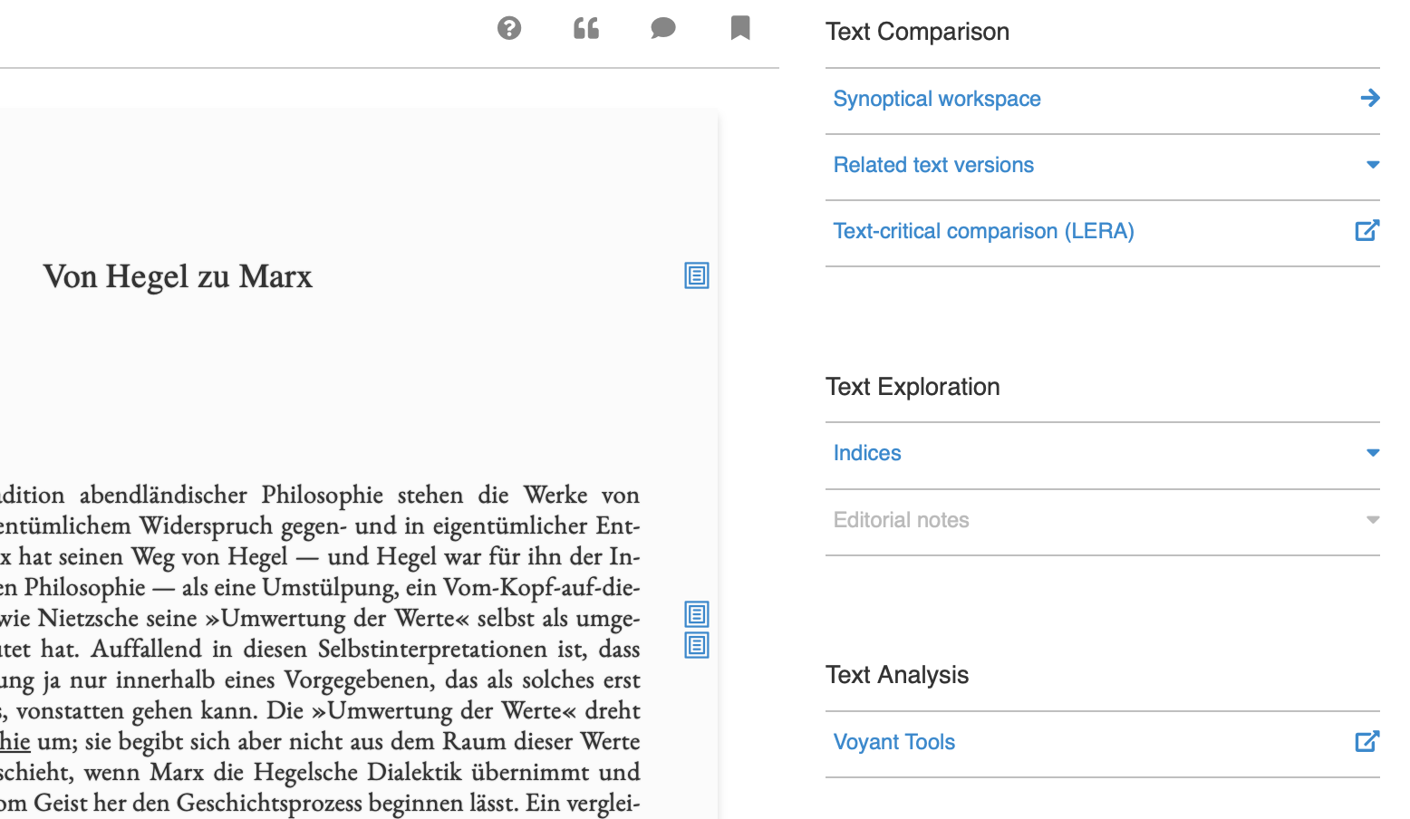 - Text Comparison, with “Synoptical Workspace”, “Related text versions” and “Text-critical comparison (LERA)”