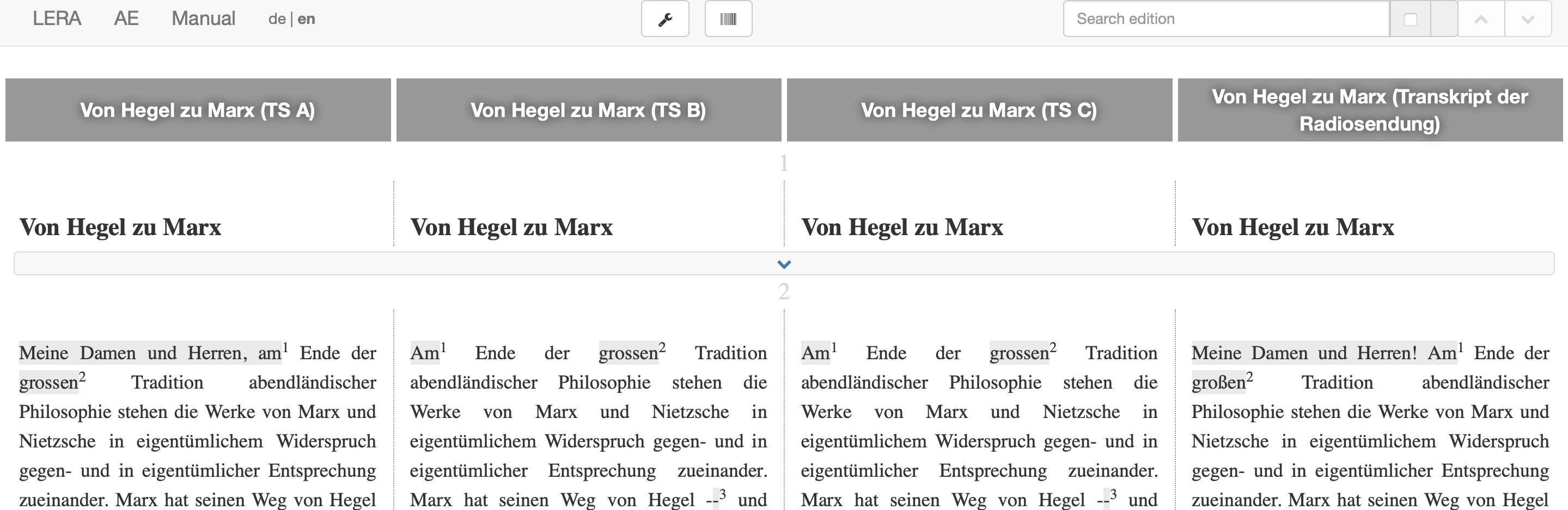Fig. 3: Screenshot of a display of multiple versions of a text based on the LERA tool.