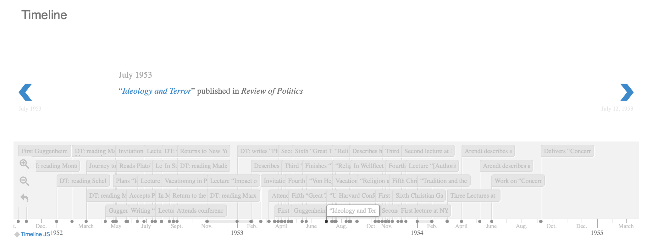 17On the user-facing side, the interface combines Bootstrap for layout and design, OpenSeadragon for high-quality facsimile presentation, LERA for text comparison, Voyant Tools for corpus-based text analysis, and Timeline.js for interactive visualizations of events. The timeline displays in chronological order key events in Hannah Arendt’s life and work, providing a valuable tool for analyzing the temporal and contextual dimensions of her production.